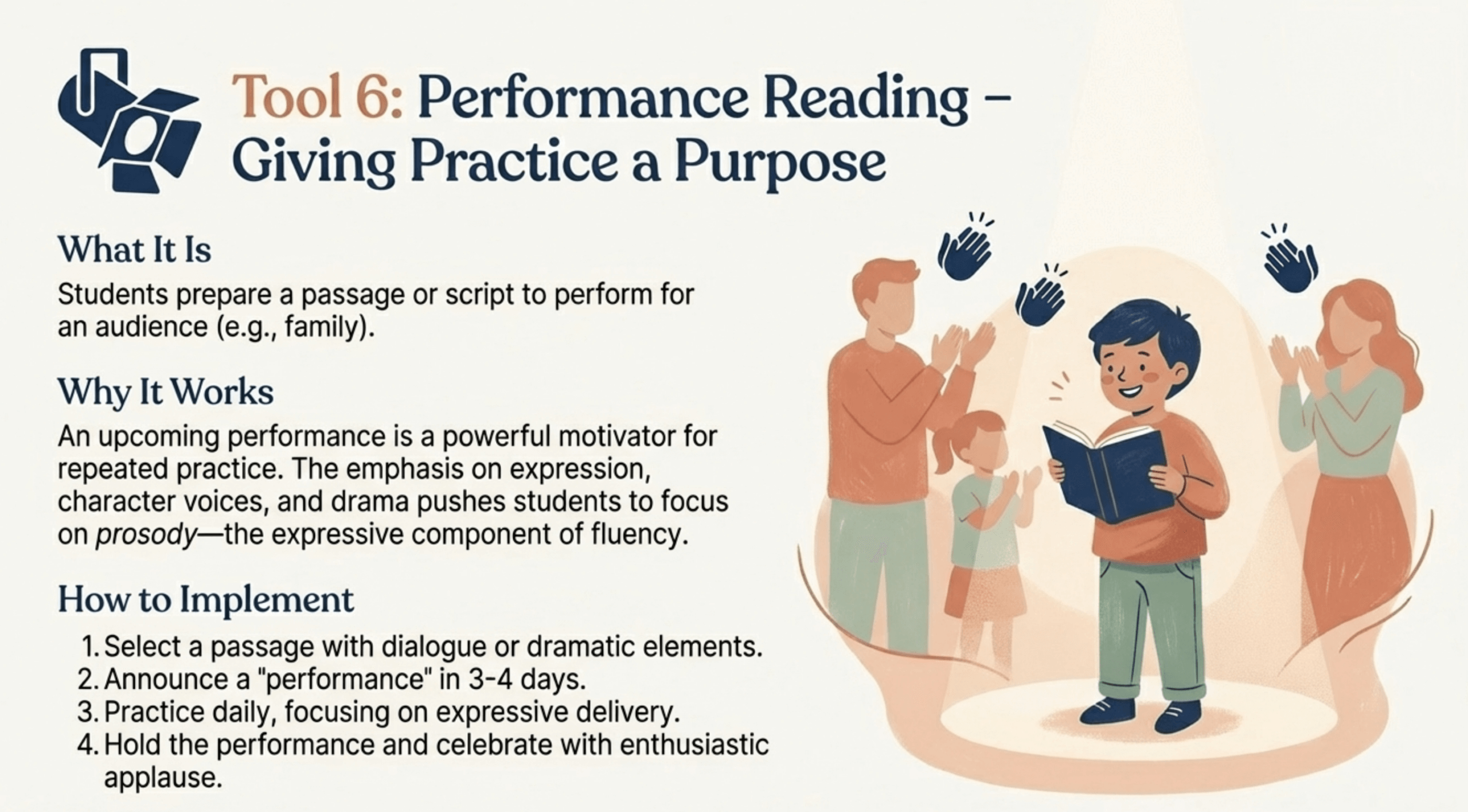 Performance reading gives students a meaningful goal—reading for an audience—which motivates repeated practice. Students willingly reread passages multiple times when preparing for a performance, naturally developing fluency through repetition.