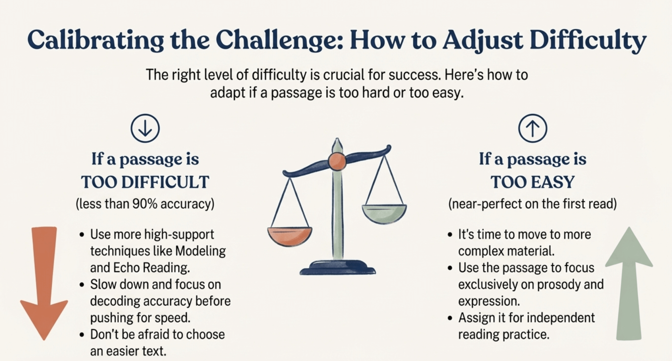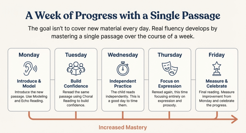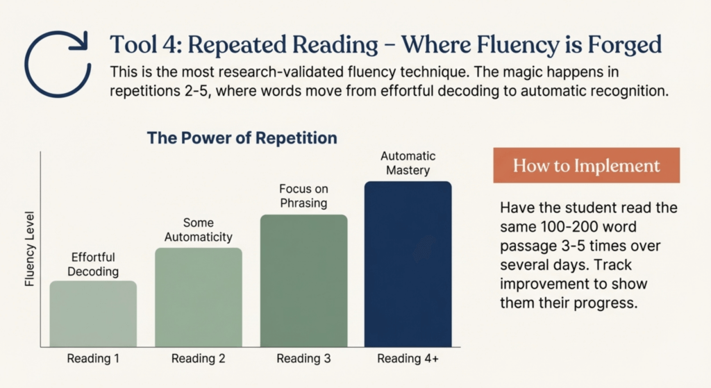Critical: Don’t abandon passages after one reading. The magic happens in repetitions 2-5, where fluency actually develops.