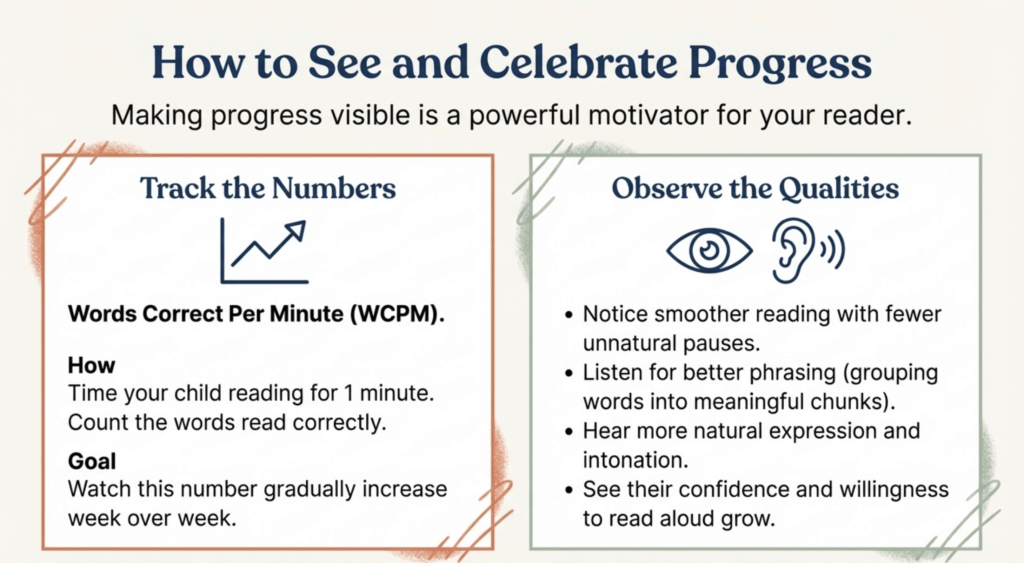 Time your child reading a passage for 1 minute. Count words read correctly (don’t count errors). Track this number weekly—it should gradually increase over time.