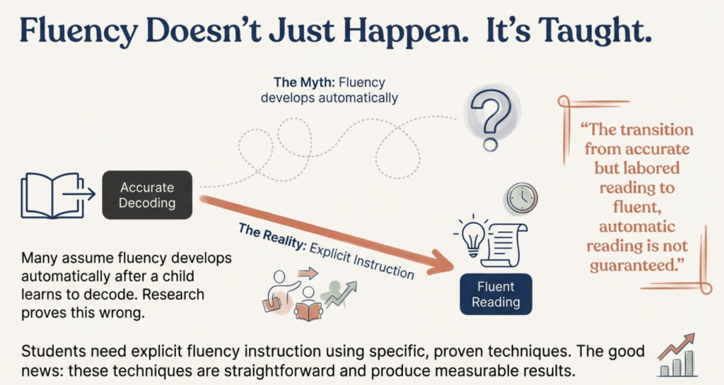 Research proves this assumption wrong. The transition from accurate but labored reading to fluent, automatic reading is not guaranteed. Students need explicit fluency instruction using specific, research-validated techniques.