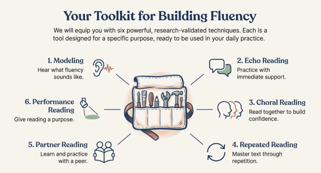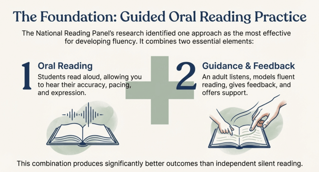 The National Reading Panel’s comprehensive review of reading research identified guided oral reading practice as the single most effective approach for developing fluency. This method combines two essential elements: