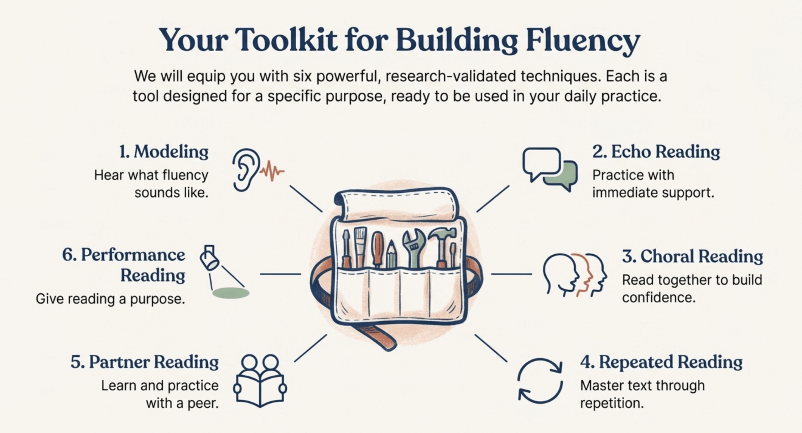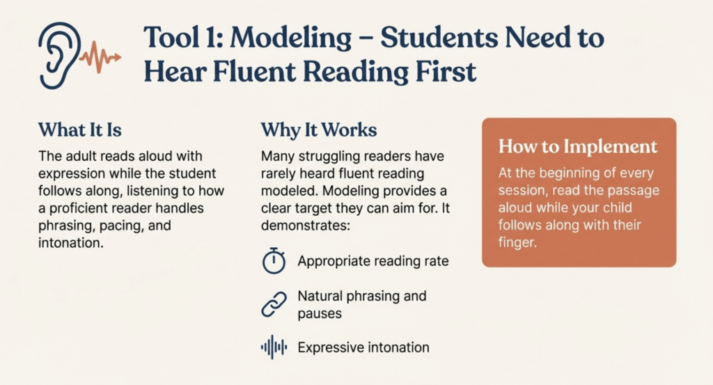 Students need to hear what fluent reading sounds like before they can produce it themselves. Modeling demonstrates: