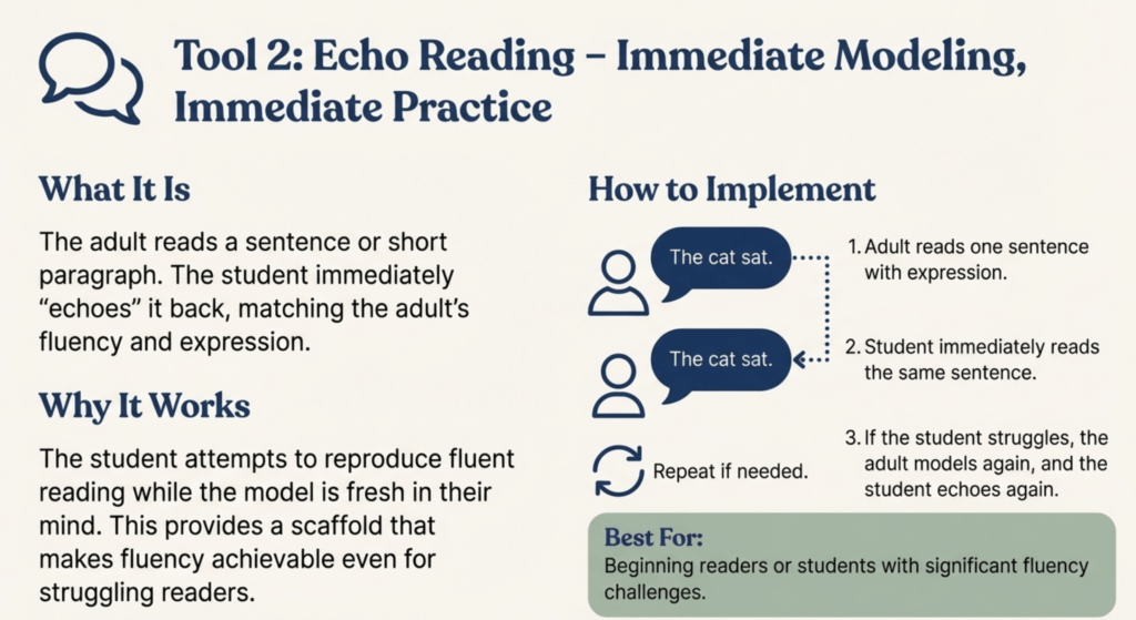Echo reading provides immediate modeling followed by immediate practice. The student hears fluent reading, then instantly attempts to reproduce it while the model is fresh in their mind.