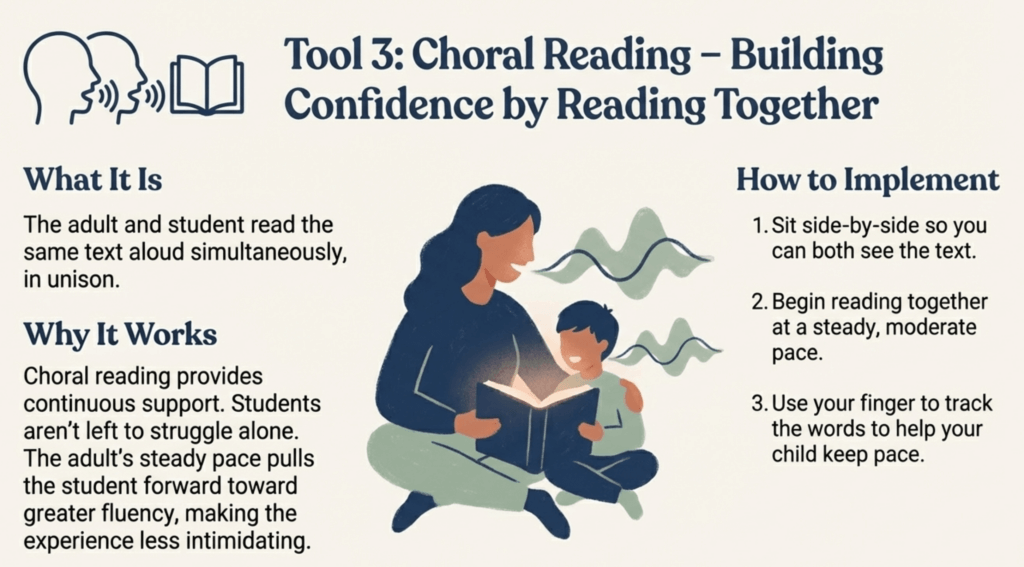 Choral reading provides continuous support throughout the reading. Students aren’t left to struggle alone—they read alongside a fluent model who maintains appropriate pacing and expression.
