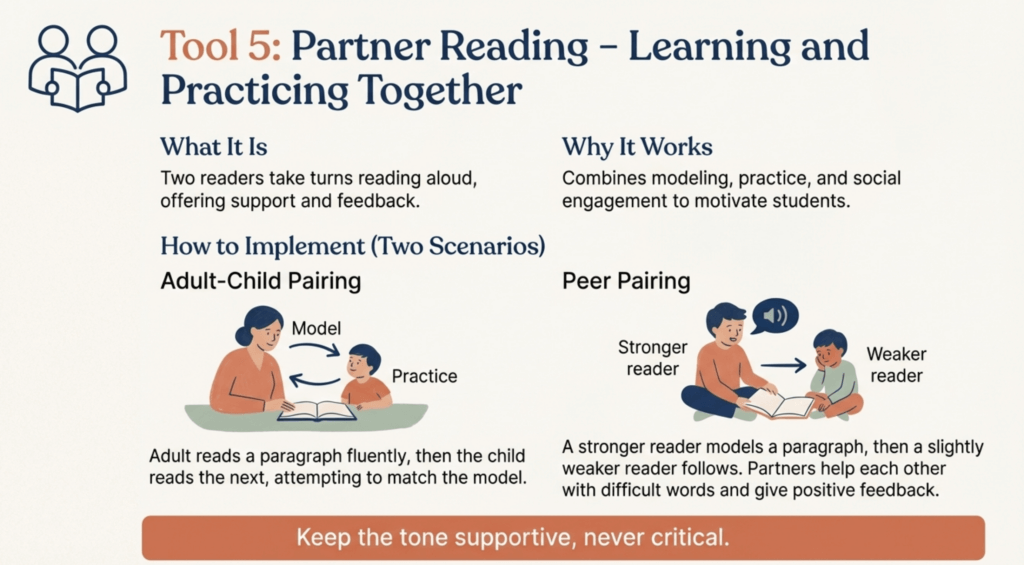 Partner reading combines modeling, practice, and social engagement. When paired with a slightly stronger reader, struggling readers hear fluent reading modeled and receive peer support. When paired with a reader of similar ability, students practice together and motivate each other.