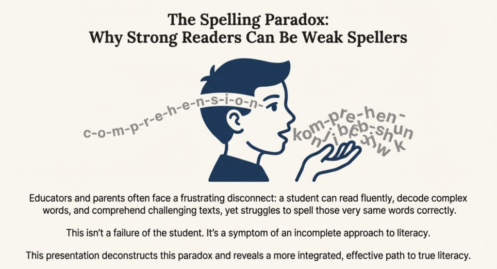 Discover why systematic spelling instruction isn’t an add-on—it’s the other half of reading. Watch our visual guide that shows how strong readers can still struggle with spelling, and why integrated instruction changes everything.
