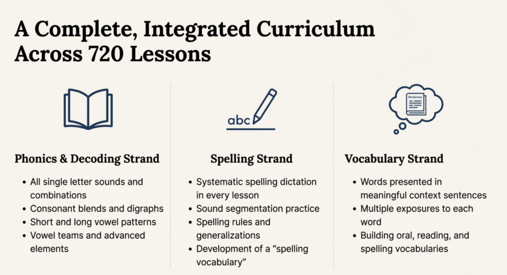 Vocabulary development occurs naturally during spelling and phonics instruction. When students spell a word, they encounter it in a meaningful sentence that illustrates its usage. When they read new words, they add those words to their mental lexicon. The three strands build together, creating a comprehensive literacy foundation.