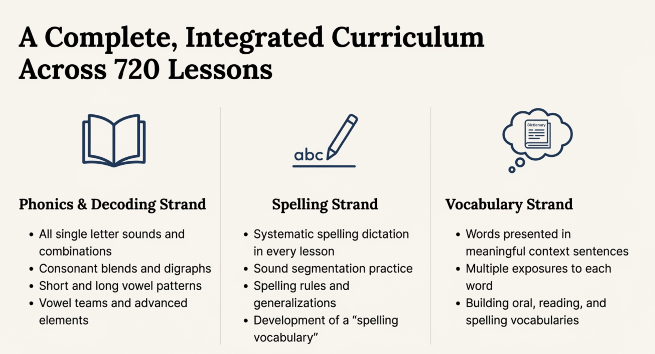 Our 720-lesson program provides comprehensive instruction across all three core literacy strands:
