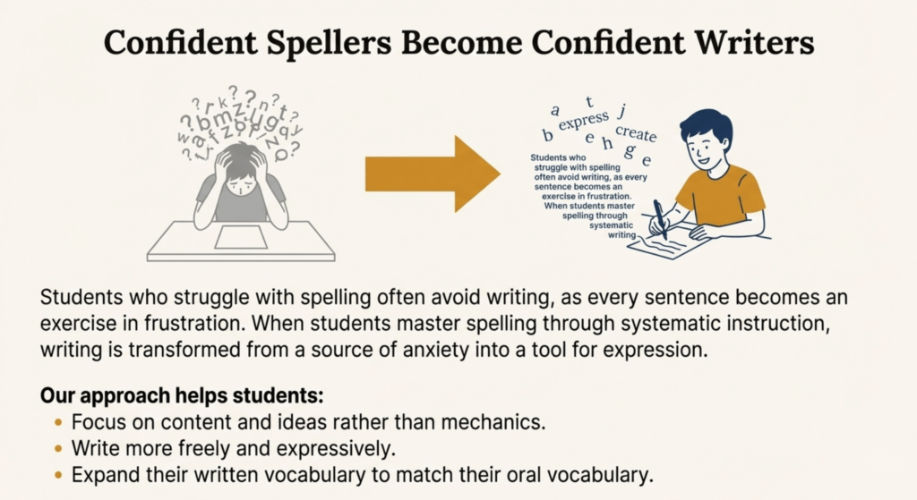Confident spellers become confident writers. Students who struggle with spelling often avoid writing because every sentence becomes an exercise in frustration. When students master spelling through systematic instruction, writing becomes a tool for expression rather than a source of anxiety.