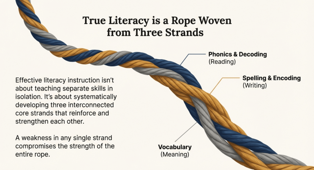 Effective literacy instruction requires systematic development of three interconnected core strands: phonics and decoding, spelling, and vocabulary. These aren’t separate skills taught in isolation—they’re deeply integrated components of comprehensive reading instruction that reinforce and strengthen each other throughout the learning process.