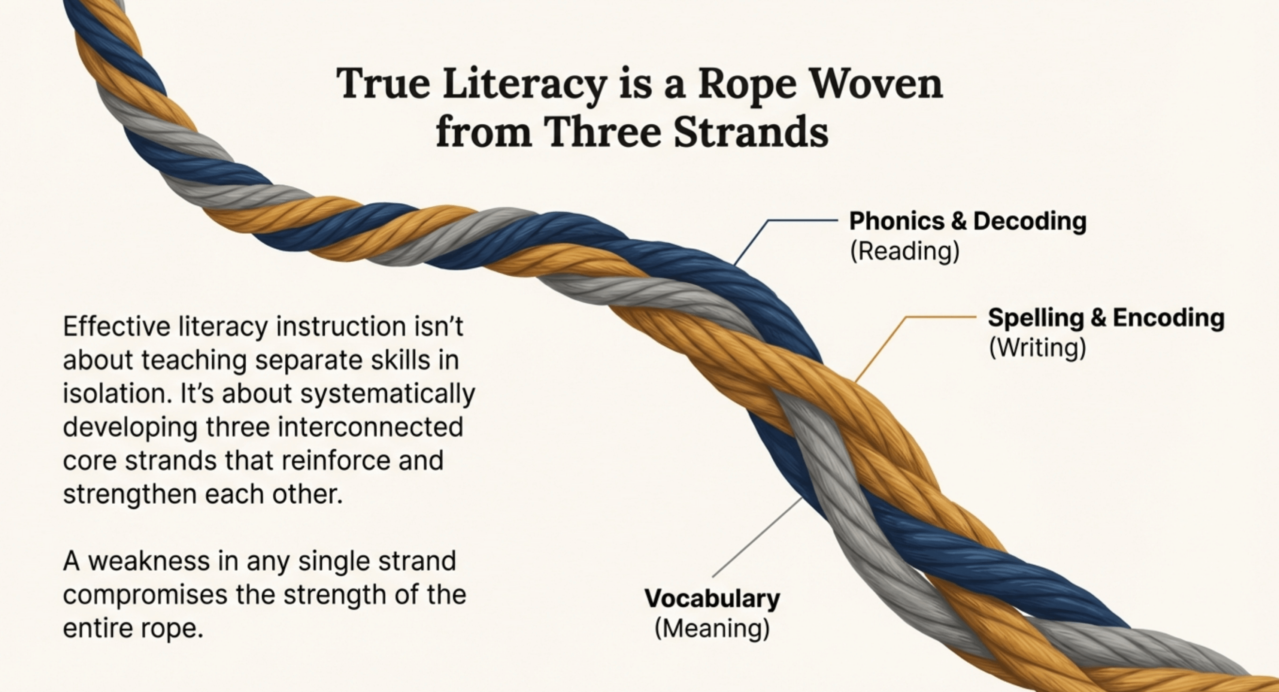 These three strands aren’t taught separately—they develop together through integrated instruction where each strand reinforces the others.
