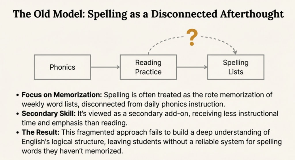 This common question reveals a misunderstanding about how literacy skills relate to each other. The answer: spelling is intrinsically connected to both phonics and vocabulary, but it’s also a distinct skill deserving focused instruction.