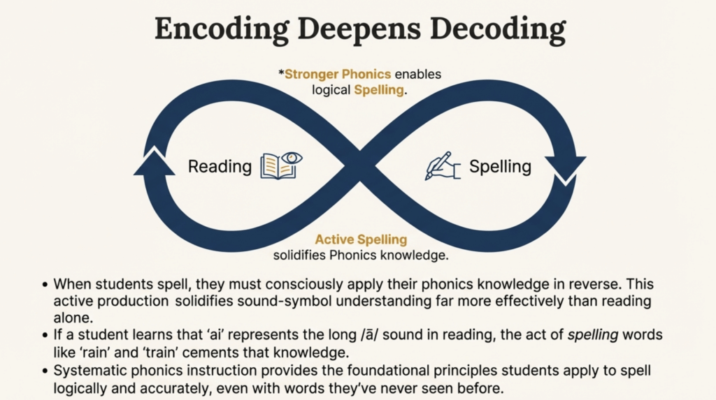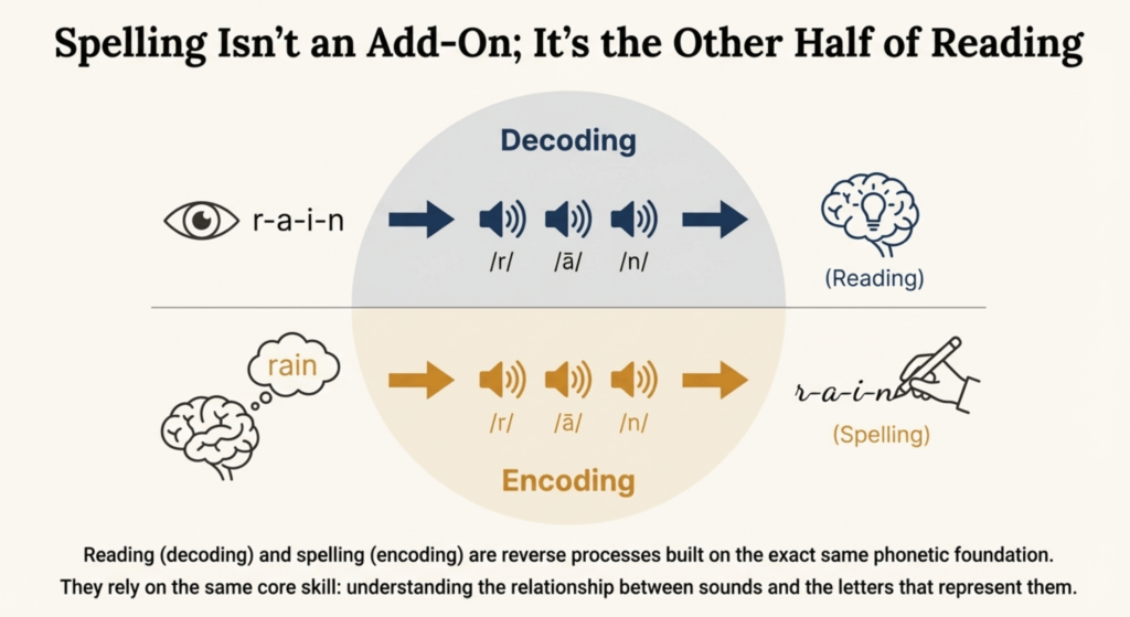 Spelling reverses the decoding process. The word’s identity is already known—the challenge is representing that word accurately in writing. Students learn:
