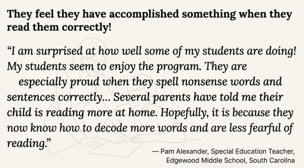 “I am surprised at how well some of my students are doing! My students seem to enjoy the program. They are especially proud when they spell nonsense words and sentences correctly. I bought small white boards for each of them. They do not use the boards for any other purpose than writing their words and sentences, so it seems like a treat to them.