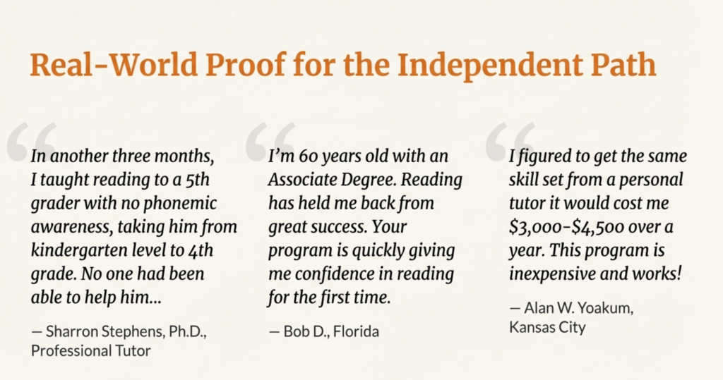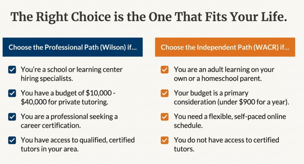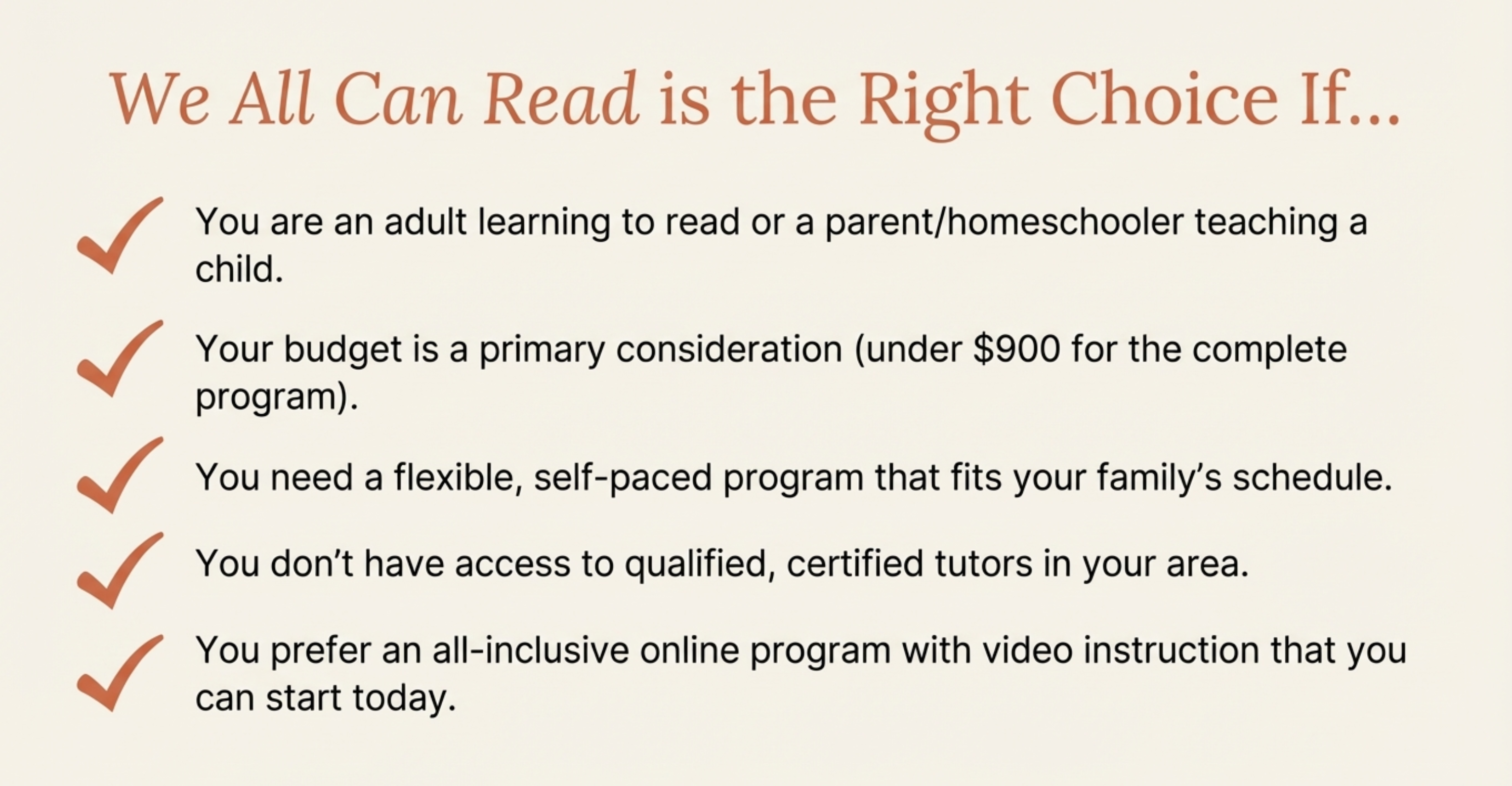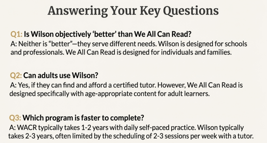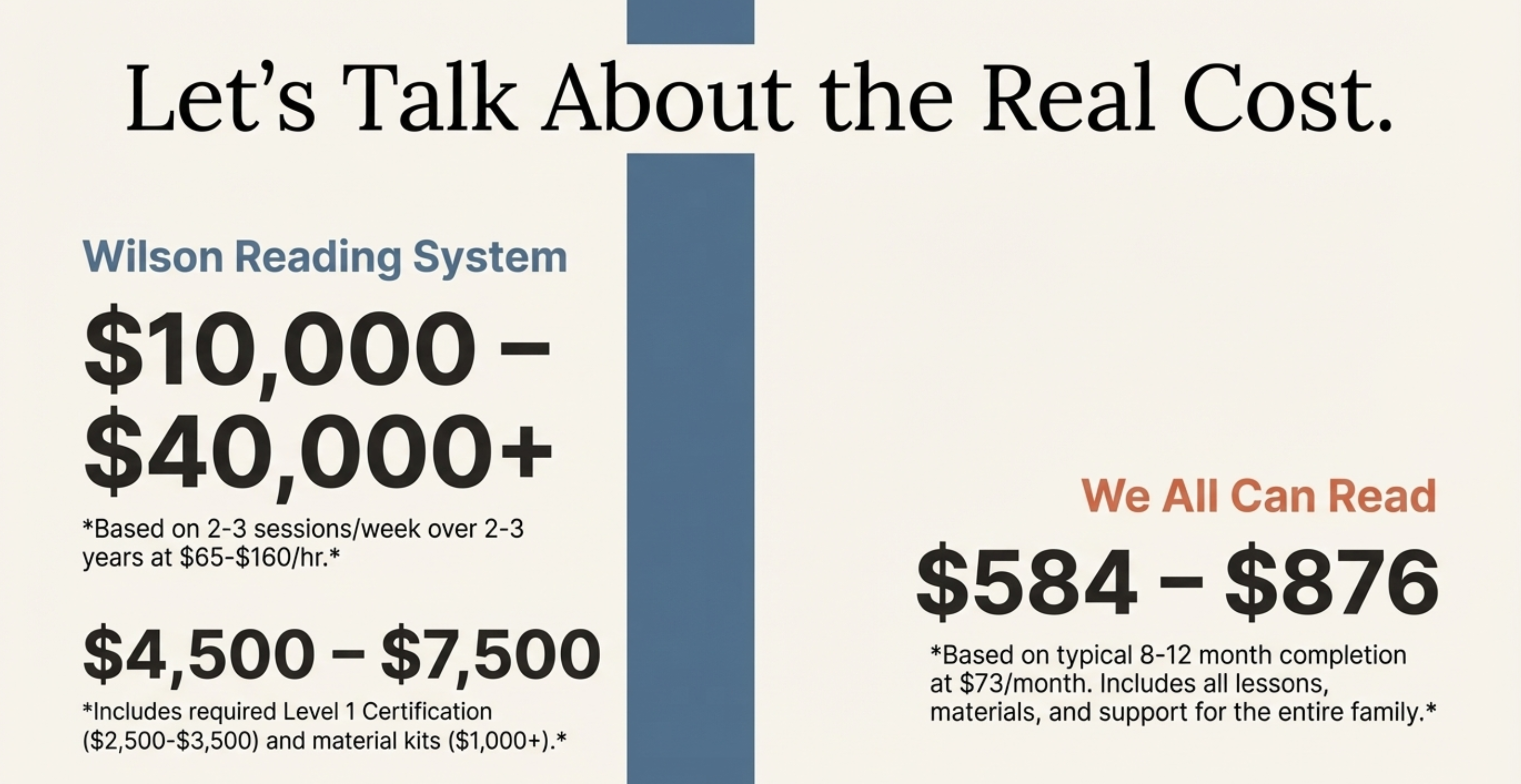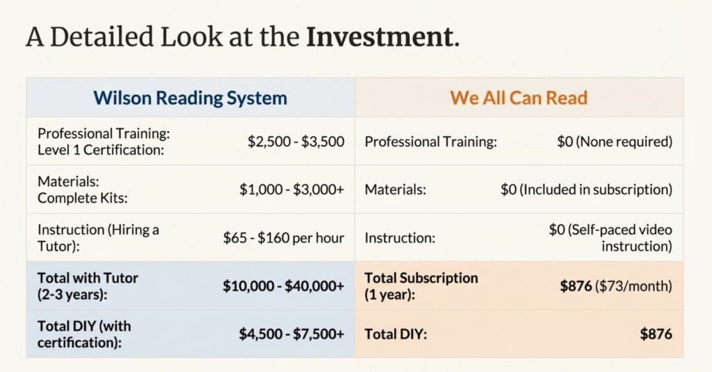 For a complete breakdown of how Wilson compares to other adult phonics options in cost and approach, see our Adult Phonics Cost Comparison Guide.