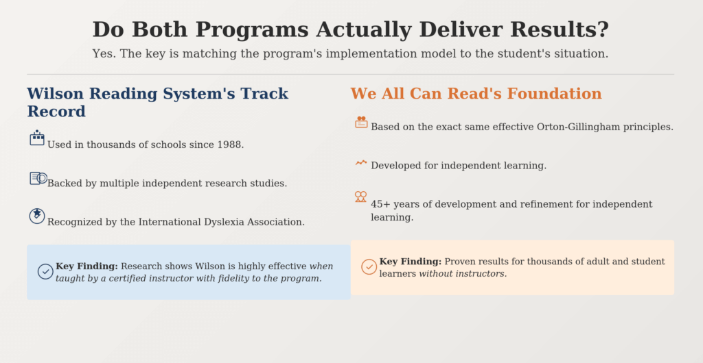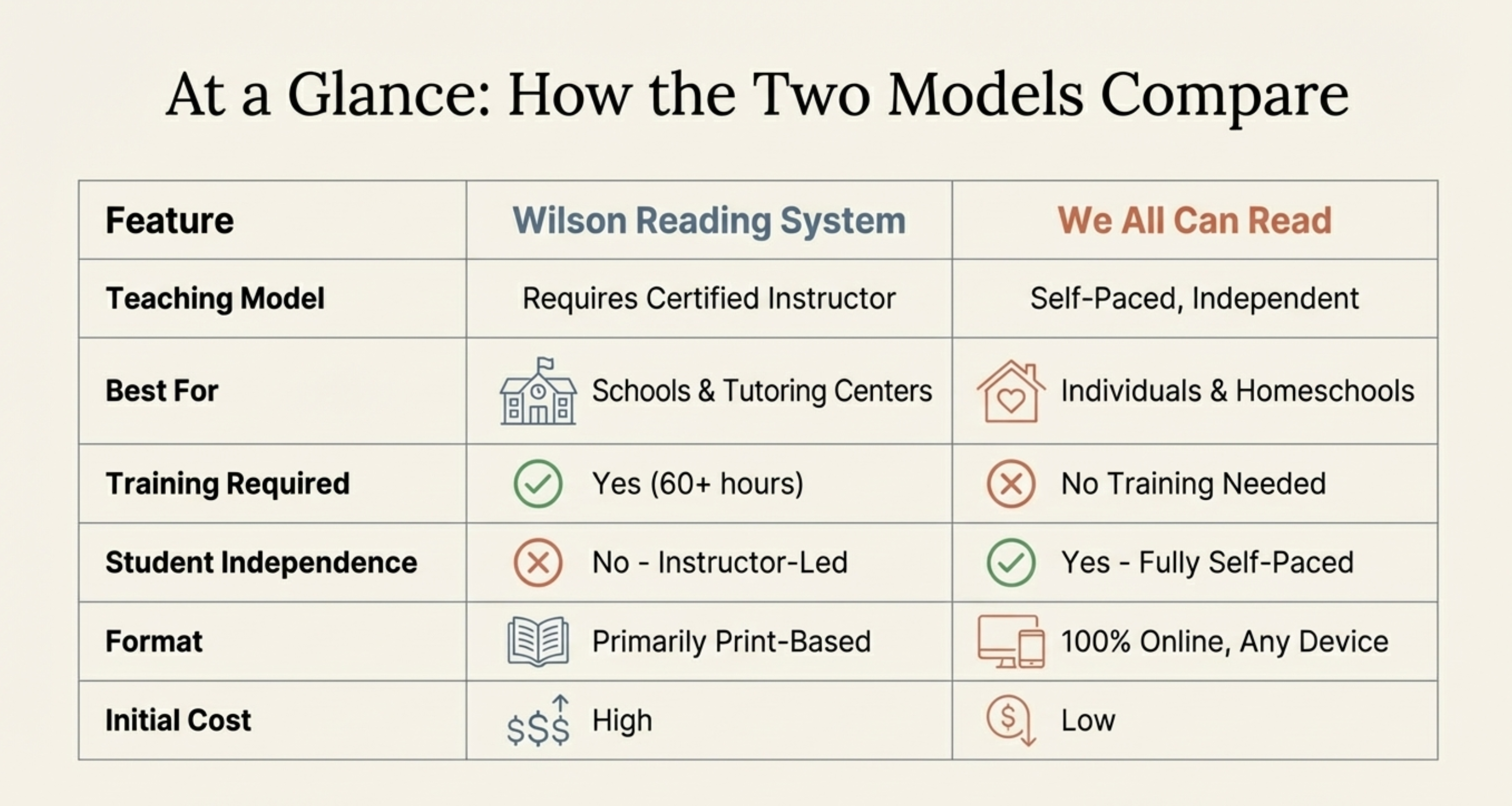 This comprehensive comparison helps you understand the real differences between Wilson Reading System and We All Can Read—both proven Orton-Gillingham programs, but designed for completely different implementation models.