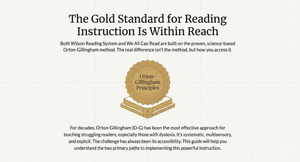 Whether you choose Wilson or We All Can Read, you’re investing in proven Orton-Gillingham instruction—the gold standard for teaching struggling readers and students with dyslexia.