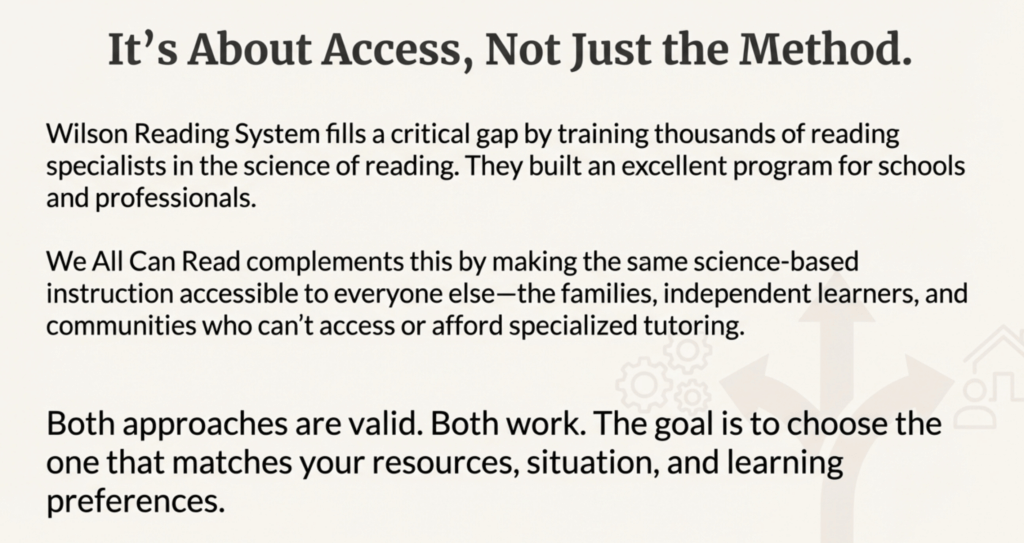 We All Can Read complements Wilson’s professional training model by making the same science-based instruction accessible to families, independent learners, and communities without access to certified specialists. Wilson built an excellent program for schools and trained professionals. We All Can Read built a program that brings the same systematic phonics instruction to everyone who can’t access or afford specialized tutoring.