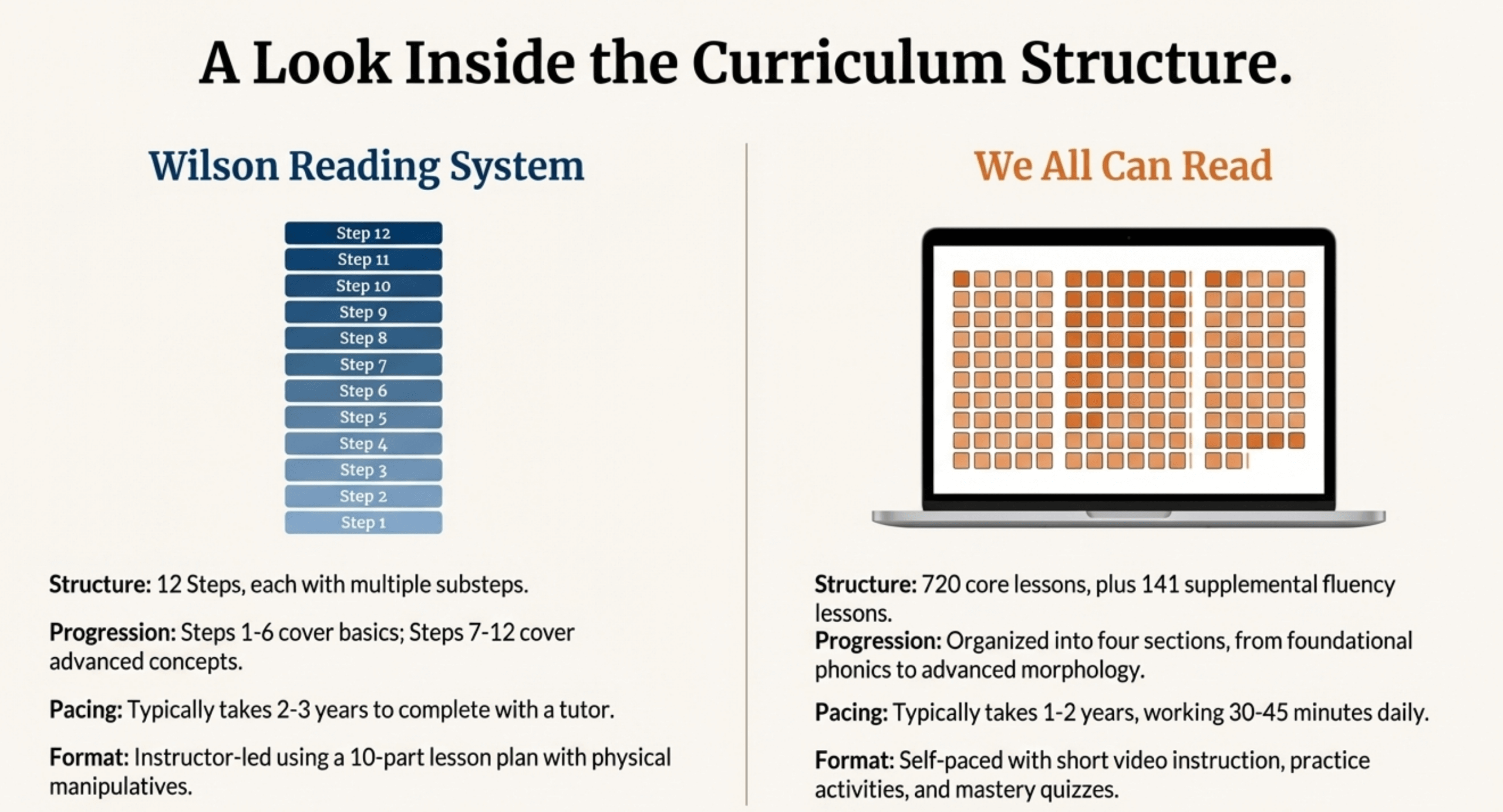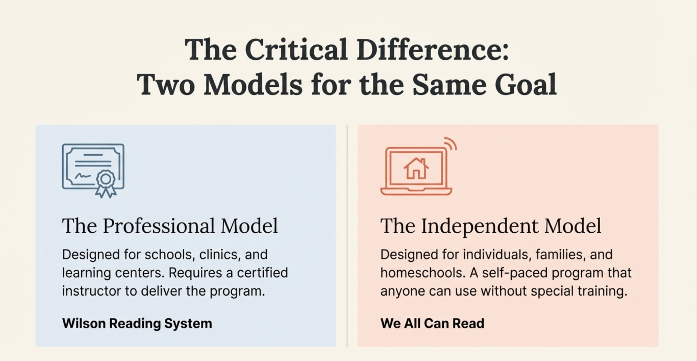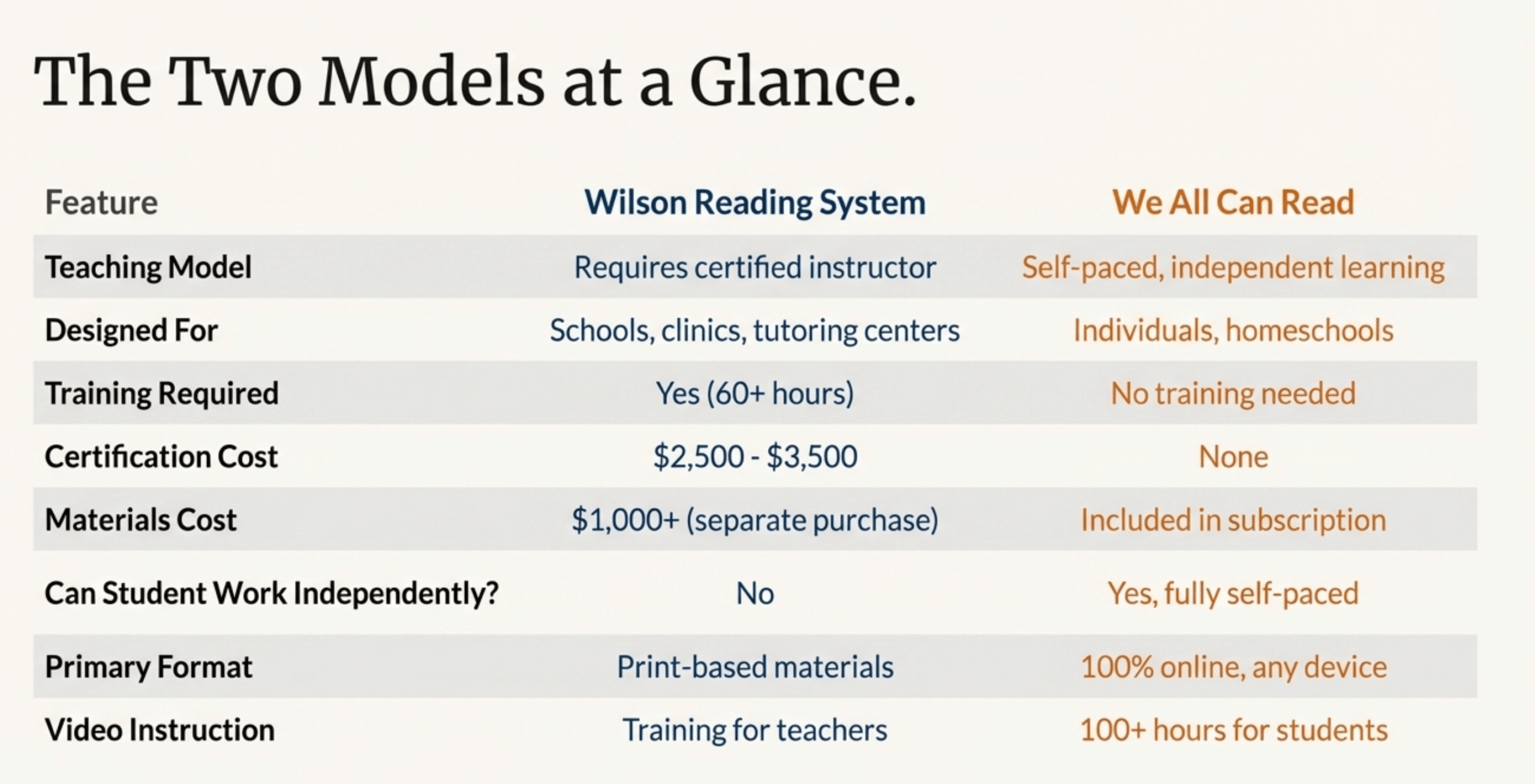This comprehensive comparison helps you understand the real differences between Wilson Reading System and We All Can Read—both proven Orton-Gillingham programs, but designed for completely different implementation models.