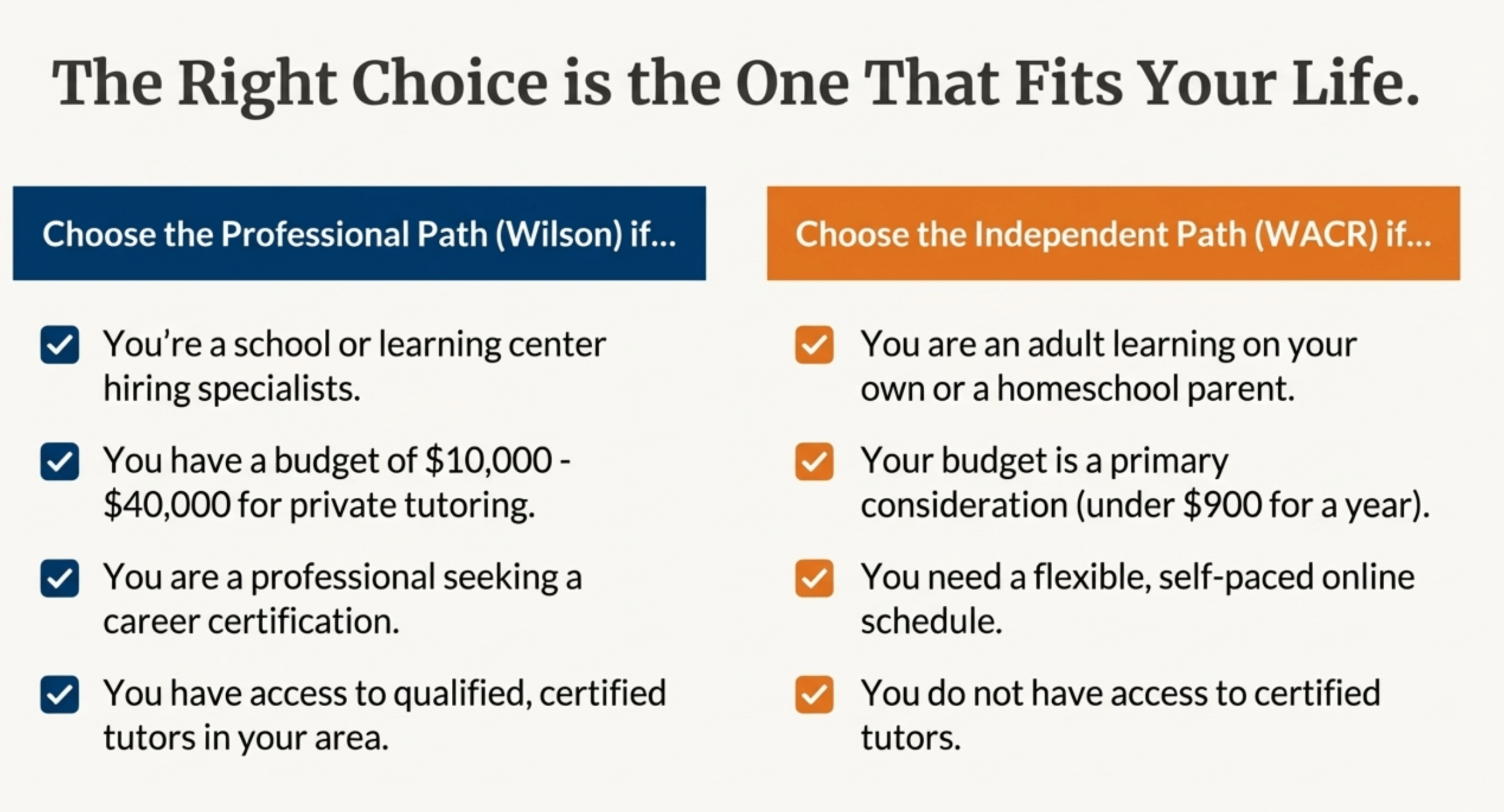 For a complete breakdown of how Wilson compares to other adult phonics options in cost and approach, see our Adult Phonics Cost Comparison Guide.