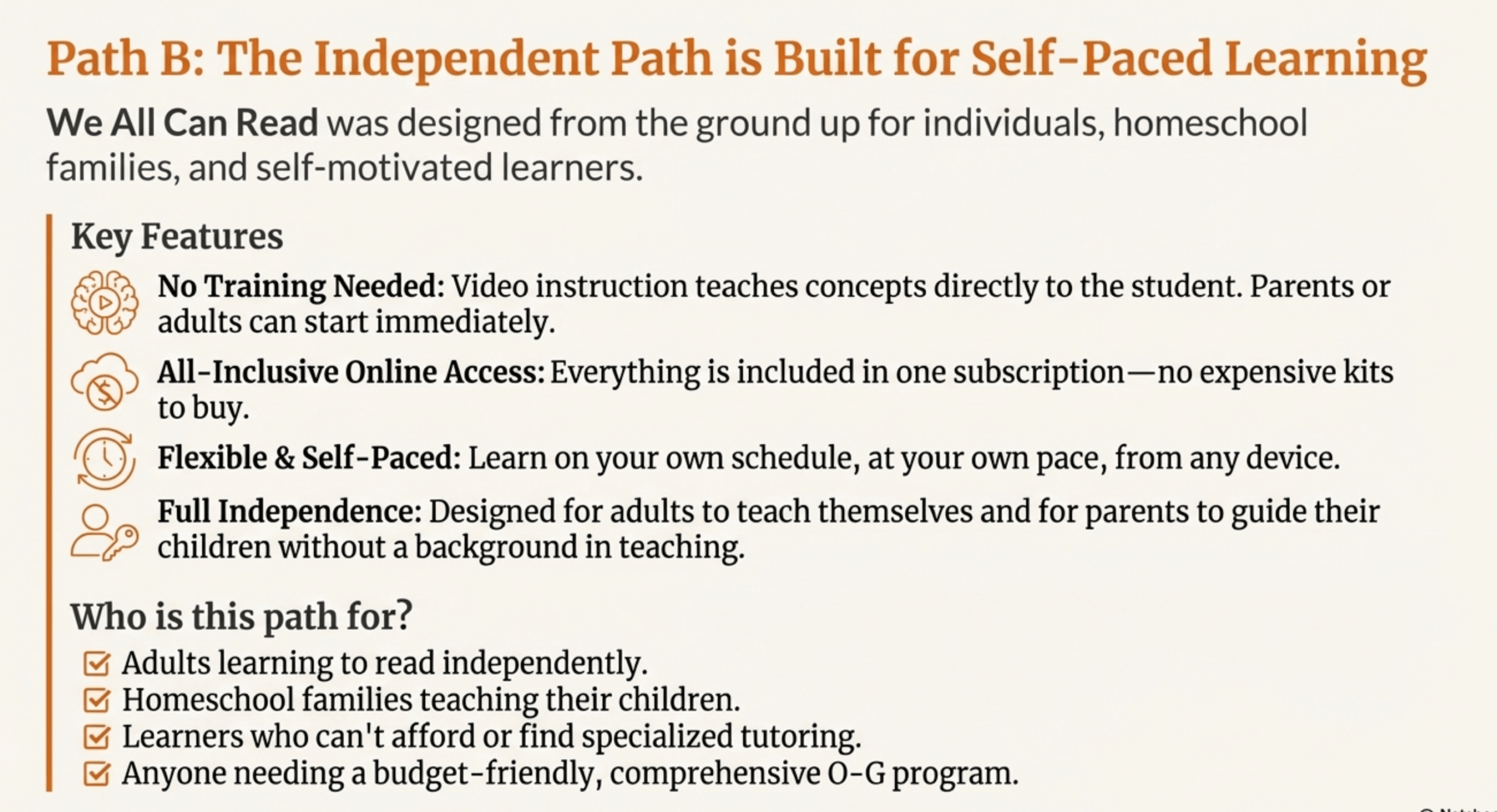 We All Can Read was designed from the ground up for independent learners, homeschool families, and self-motivated students who don’t have access to specialized instruction.